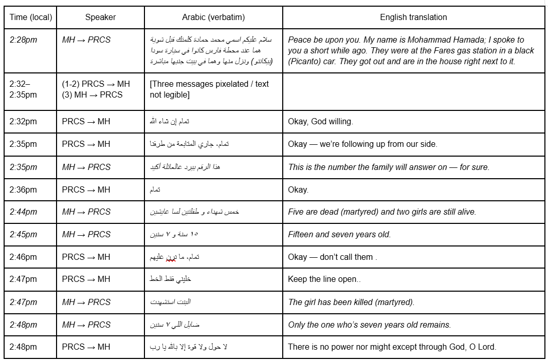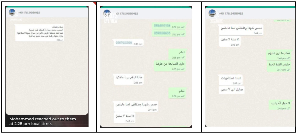 WhatsApp transcript omissions: Two key messages appear in the Arabic screenshots featured in the English-language Al Jazeera investigation, but are missing from the English narration and all subsequent coverage: the first message noting that two family members had left the car, and the final message in which Mohammed Hamada informs the Red Crescent that Layan has been killed. These omissions directly contradict both the narrative that the family remained trapped inside the car throughout, and the Red Crescent’s account of their supposed final call with Layan — underscoring the significance of what was left out..